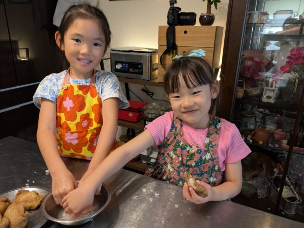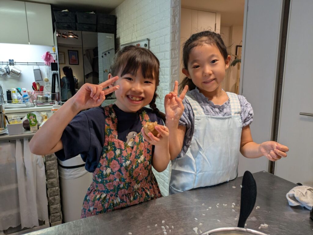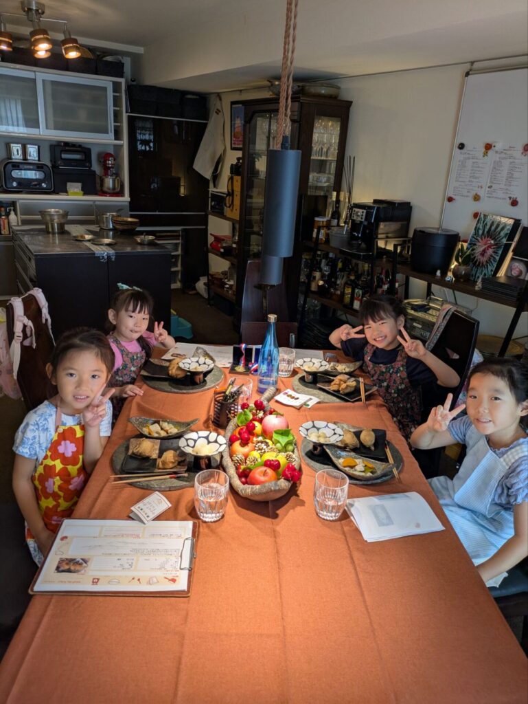 おいなりさん 鶏肉の治部煮 豆乳白玉 この日のメニューは和食でした。 お料理にとても興味のある4人で真剣にレッスンを受けてくれました。 手水をつけてお稲荷さんをつめています。 とても楽しそう。 白玉も上手に丸めることが出来ました。 最後はみんなでポーズ